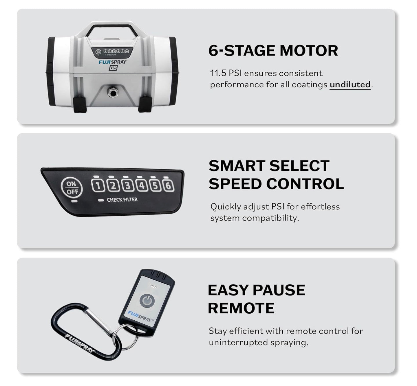 Fuji Spray®’s D6 sets a new benchmark in the spray finishing industry, offering a powerful 6-stage motor rated at 11.5 PSI. Engineered for efficient and cooler operation, the D6 is designed to prolong motor life and maximize return on investment. With 6 pre-set pressure settings, users gain precise control over spray output, ensuring professional-grade results with minimal overspray and waste.
