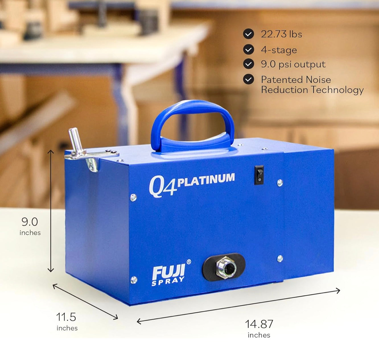 The Fuji Spray® Q PLATINUM™ Series is for those who simply want the best spray experience. Considered the quietest operating turbine on the market today, the Q PLATINUM™ Series is the ultimate tool in terms of power and control, allowing you to focus on what really matters – the quality of your work. The patented noise reduction technology coupled with the unique Heat Dissipation Chamber™ makes the Q PLATINUM™ series stand out in the industry. The Q PLATINUM™ Series systems are perfect for medium to heavy painting projects, as well as finishing cabinets, furniture, trim and more. Exclusive to Fuji Spray® – The Fuji Spray® Heat Dissipation Chamber™